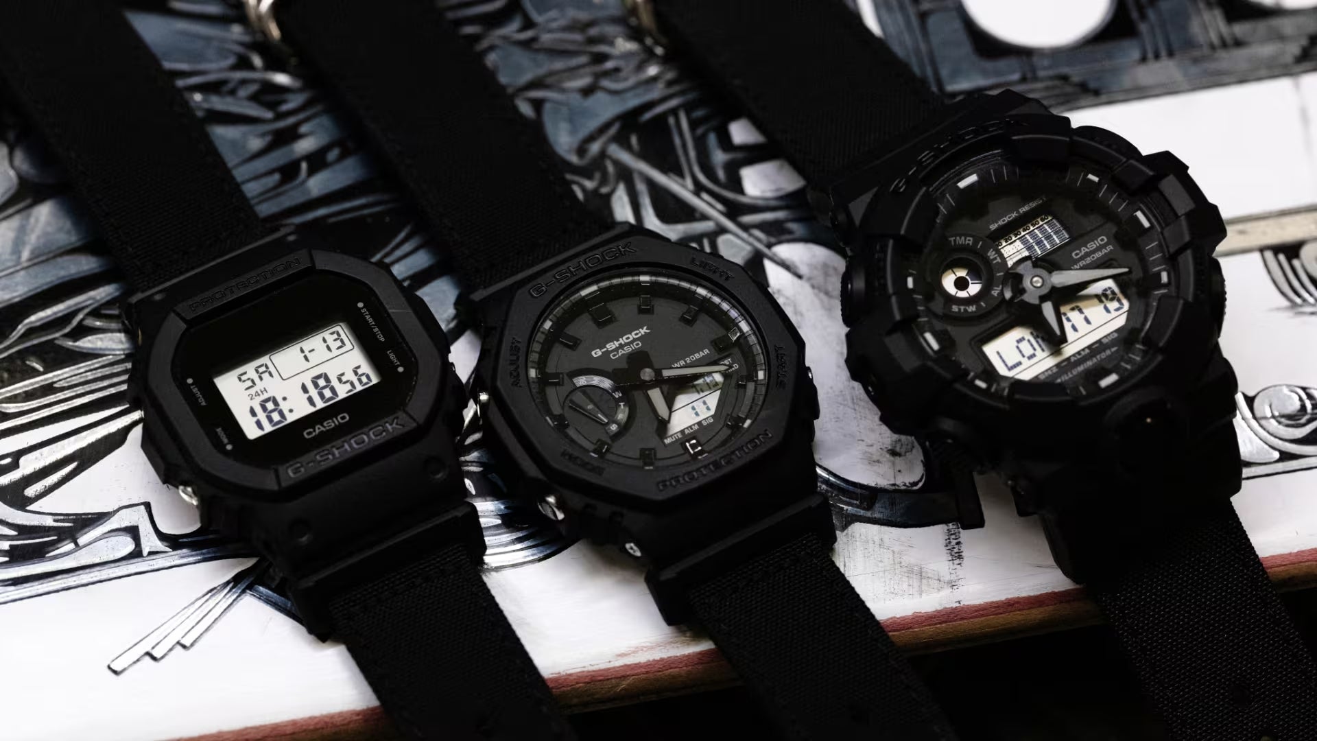 La nueva serie Utility Black lleva tres de las formas más populares de G-SHOCK a un nuevo nivel. Ya sea con la icónica forma octogonal de la serie GA-2100, el emblemático diseño del DW-5600 o la inconfundible caja de gran tamaño del GA-700, todos los modelos están diseñados con un moderno look todo de color negro y equipados con correas CORDURA® Eco Fabric prácticamente indestructibles.