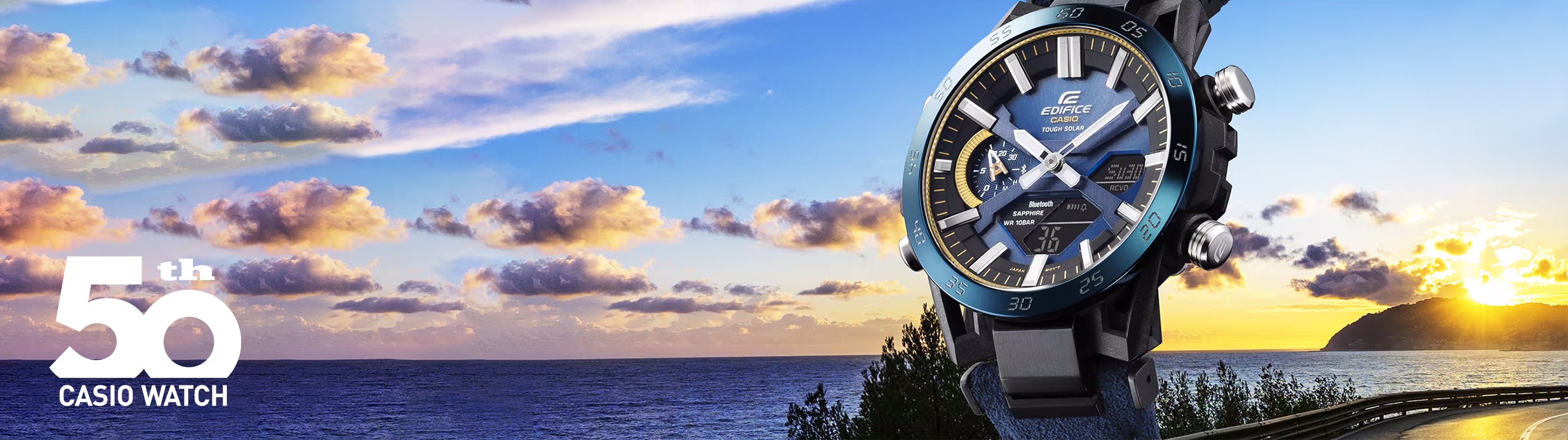 Los tonos de azul inspirados en el cielo y el mar se acentúan con el dorado que expresa el resplandor de la luz del sol. En homenaje al Casiotron original, el bisel IP azul está grabado con indicaciones de minutos en una fuente digital con un estilo de visualización de siete segmentos, y el anillo de la esfera y el anillo de la esfera insertado presentan el diseño estriado icónico del reloj.
